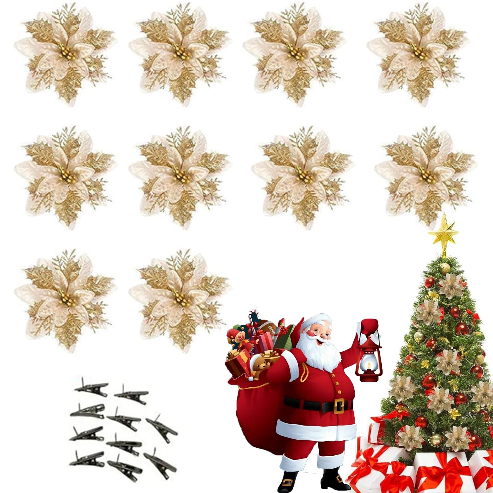 | Kwiaty choinkowe z klipsem, kwiaty świąteczne do dekoracji, sztuczne kwiaty świąteczne, brokatowe gwiazdki na wesele choinka ozdoby noworoczne, 10 szt. (złoty) | B0FLQ8DRJK | 1 | 7.26 | 48.42 |