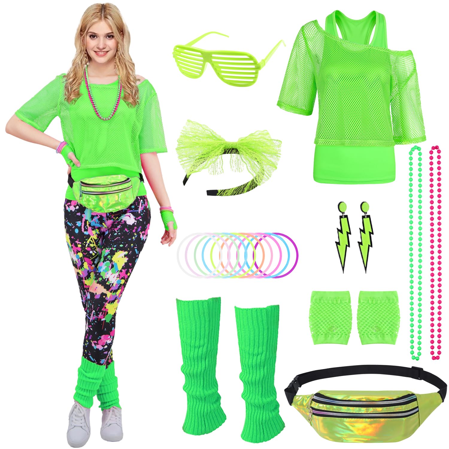 | Strój damski w stylu lat 80. i 90., neonowy strój na imprezę z siatki, tank top, kieszeń na brzuch, ocieplacz na nogi, opaska na czoło, kolczyki, naszyjnik, naszyjnik w stylu lat 80., 90., zestaw | B0CH6L2TRM | 3 | 30.05 | 300.45 |