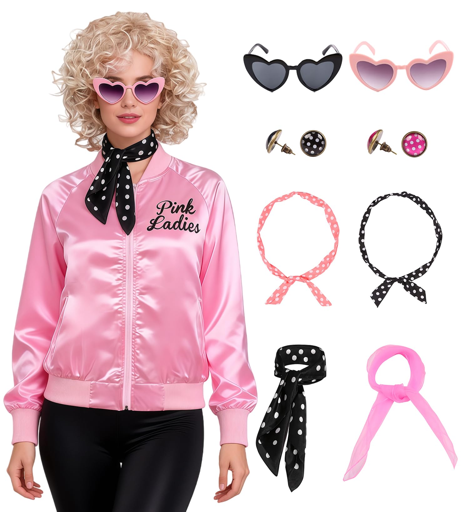 | Pink Ladies damski strój w stylu lat 50., szykowna kurtka, kostium dla kobiet, różowa kurtka z satyny, z okularami, kolczyki, Halloween, karnawał, imprezę kostiumową | B0CD2LBCP5 | 1 | 5.04 | 71.74 |