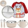 | MOJINL Zestaw naczyń dla niemowląt ze stali nierdzewnej z przyssawką, 6 sztuk, zestaw naczyń dla dzieci z talerzykiem dla niemowląt, kubkiem do nauki picia, śliniaczkiem z rękawami, łyżką, widelcem | B0F5WDQ5Q2 | 1 | 14.76 | 98.41 | |