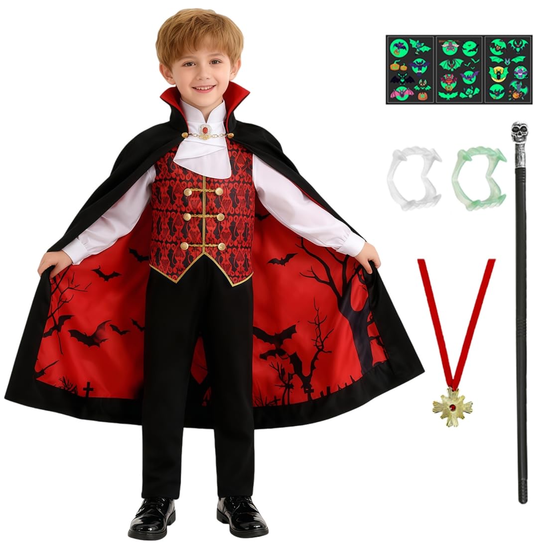 | Kostium wampira dla dzieci, chłopców, peleryna wampira, zęby, tatuaż, naklejka berło, Halloween, karnawał, impreza tematyczna | B0D9W45QYY | 9 | 45.56 | 911.52 |