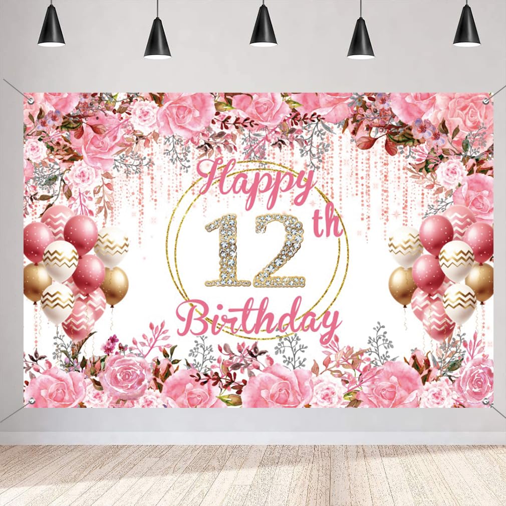 | Dekoracja na 12. urodziny dziewczynka Happy 12th Birthday Baner tkanina tabliczka plakat, baner na 12. urodziny tło, przyjęcie urodzinowe, tabliczka powitalna z różowym elementem kwiatowym | B0FPFMWQ8C | 1 | 1.95 | 39.18 |