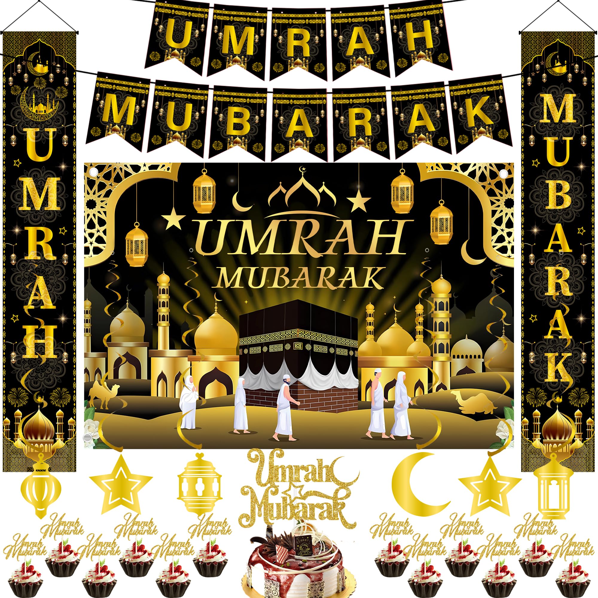 | Umrah Mubarak dekoracja na imprezę, baner - 23 szt. złoto-czarny Ramadan Eid dekoracja impreza wiszące tło nakładki na ciasto muzułmańskie muzułmańskie festiwale muzułmańskie | B0G8HP8HLP | 7 | 12.44 | 248.43 |