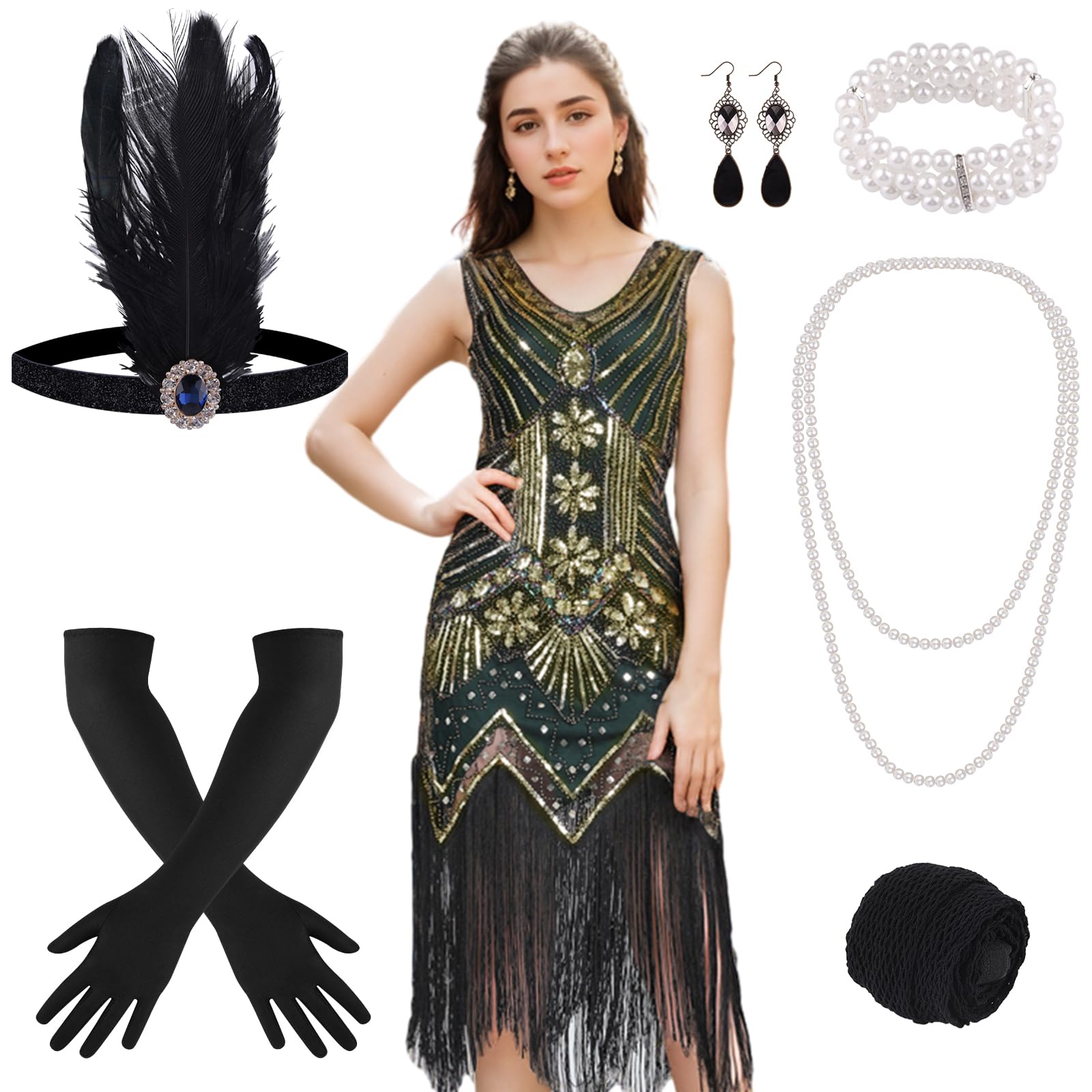 | FEPITO Flapper-Kleider im Stil der 1920er Jahre für Damen, mit Fransen und Pailletten besetztes Great Gatsby-Kleid für Damen mit Accessoires im Stil der 20er Jahre(green(style 3), Large) | B08JYSTYL3 | 1 | 8.08 | 115.31 |