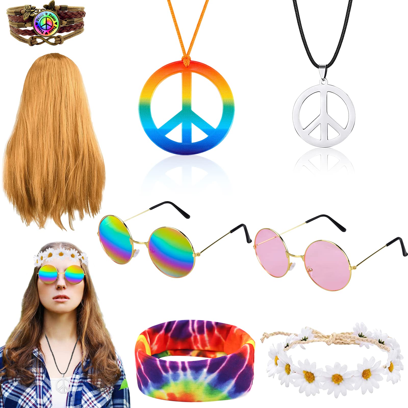 | 8 sztuk zestaw kostium hippie, hippisowska peruka przebranie akcesoria zestaw okularów przeciwsłonecznych, znak pokoju, naszyjnik, bransoletka, opaska na imprezę, muzykę, festiwal, lata 60-te, 70-te | B0BZRLRGGP | 75 | 201.45 | 4029 | |