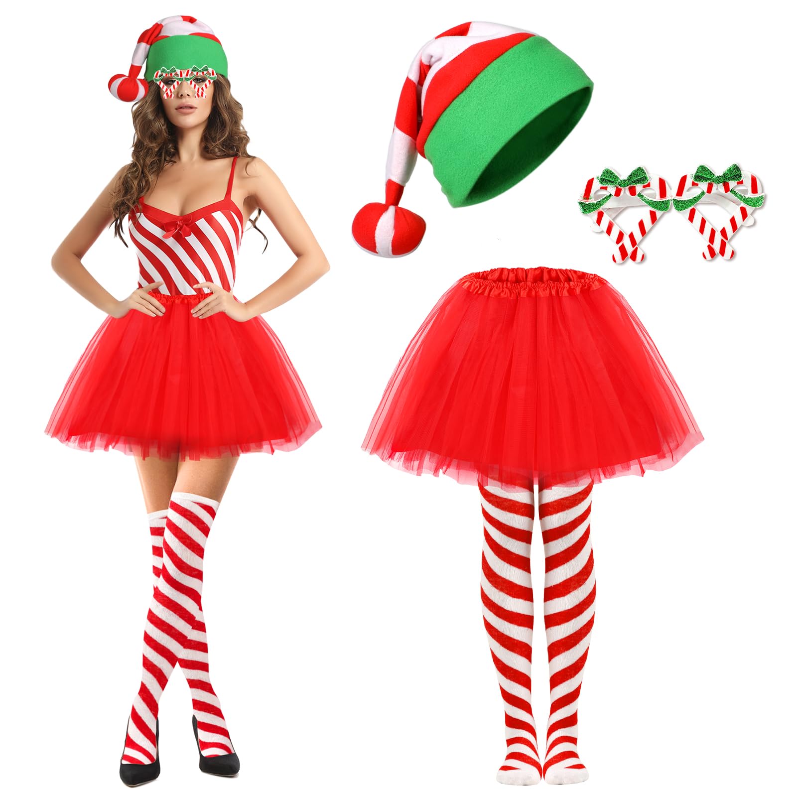 | Świąteczny kostium laski cukrowej dla kobiet i dziewcząt, czapki bożonarodzeniowe, laska cukrowa, okulary, czerwona spódnica tutu, podkolanówki w paski, świąteczny strój laski cukrowej, kostiumy | B0DDT1KP1G | 1 | 7.07 | 67.19 |