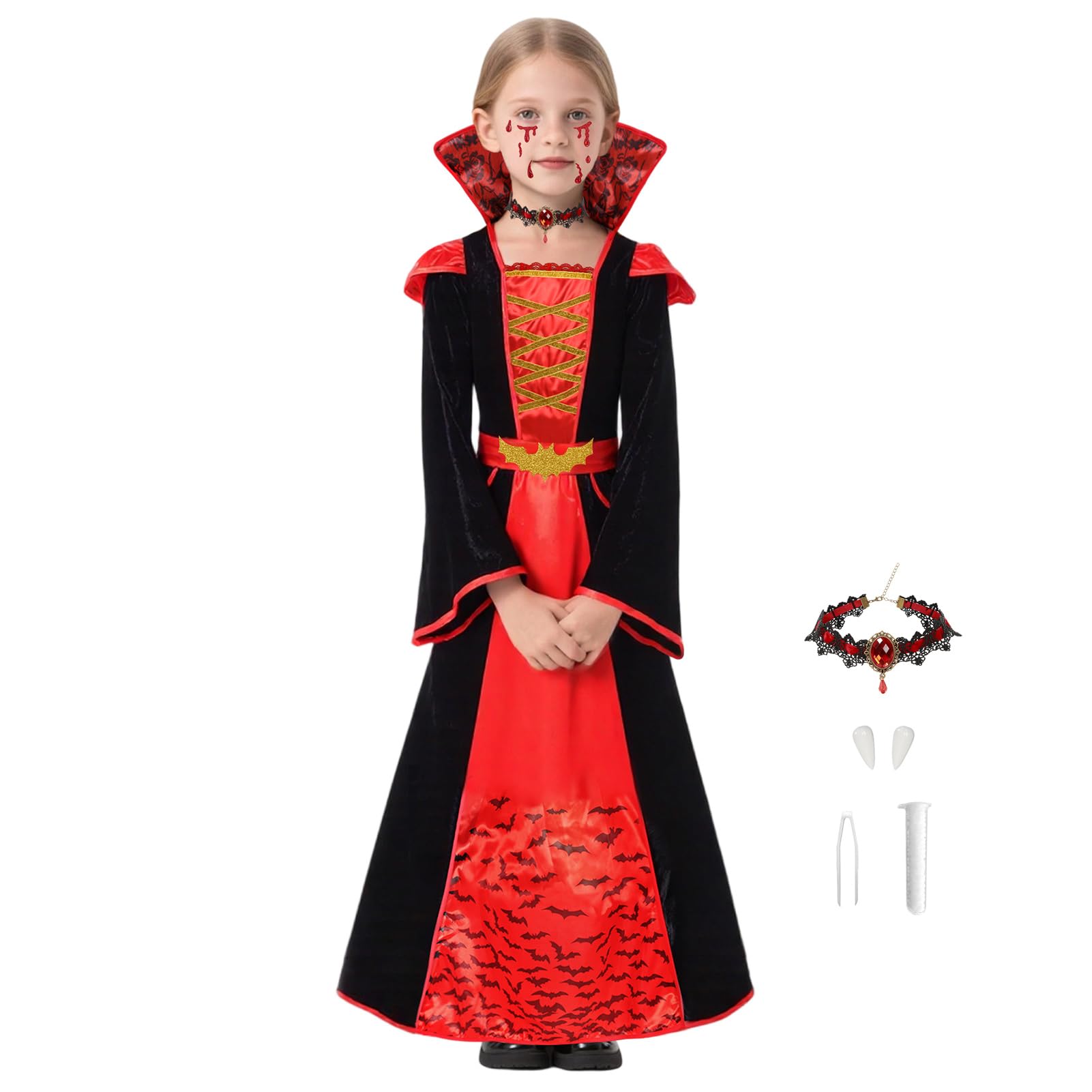 | Kostium wampira dla dziewczynki, kostium wampira na Halloween, kostium dziecięcy, kostium wampira, sukienka z różą rubinową, naszyjnik, ugryzienie wampira, przebranie karnawałowe, Cosplay | B0FJ2CTQPC | 3 | 26.71 | 242.94 | |